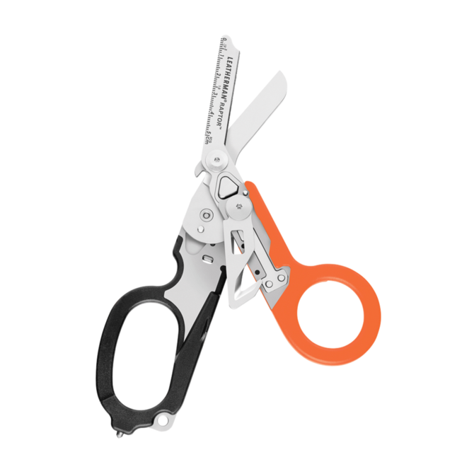 Foldable medical shears with an oxygen tank wrench, strap and ring cutters and a carbide glass breaker. Holster included.