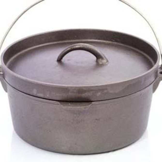 Larger 9 quart (equivalent to approximately 8.5 litres) cast iron camp oven.